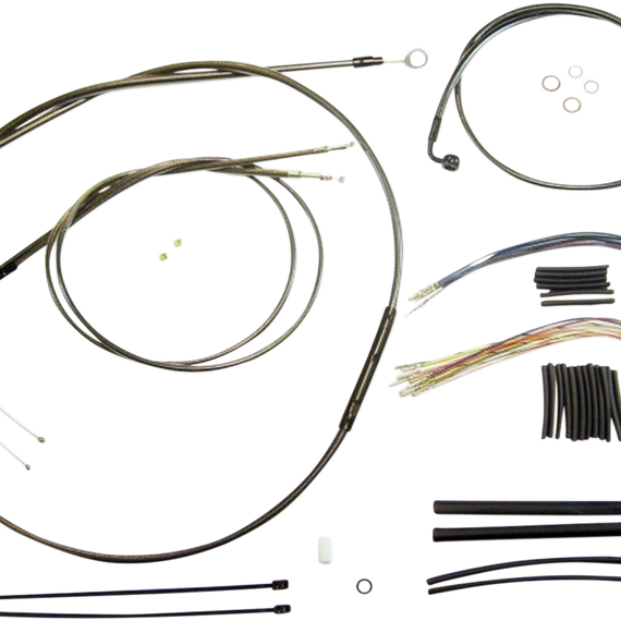 Caracteristicas: The only complete kits with matching braided cables and brake lines Kits include throttle and idle cables of throttle-by-wire extensions, clutch cable or hydraulic clutch line, brake lines, copper crush washers, hardware, and any necessary switch wiring of turn signal extension All cables are a low-effort, high-efficiency design that meets or exceeds all OE specifications for fitment, construction, endurance Kits for dual disc models include an all brazed manifold that eliminates leaks, alignment problems and unattractive threaded connections Assembled in the U.S.A. Kits are based on using ape hanger style handlebars with 2” risers
