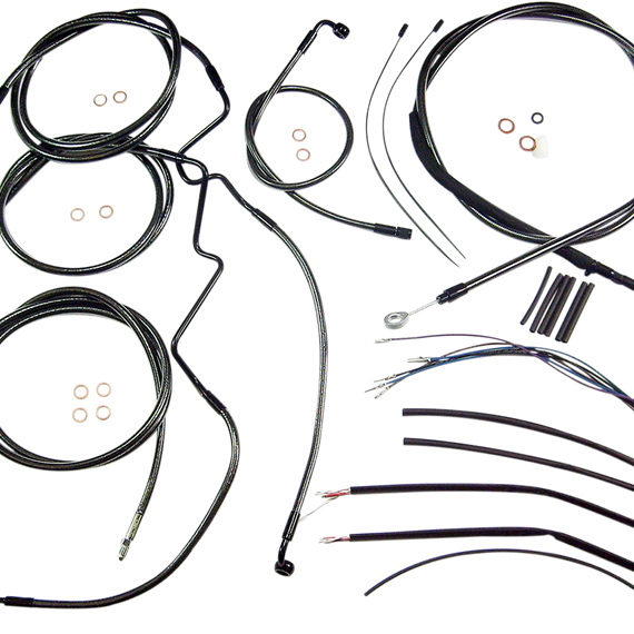 Caracteristicas: The only complete kits with matching braided cables and brake lines Kits include throttle and idle cables of throttle-by-wire extensions, clutch cable or hydraulic clutch line, brake lines, copper crush washers, hardware, and any necessary switch wiring of turn signal extension All cables are a low-effort, high-efficiency design that meets or exceeds all OE specifications for fitment, construction, endurance Kits for dual disc models include an all brazed manifold that eliminates leaks, alignment problems and unattractive threaded connections Assembled in the U.S.A. Kits are based on using ape hanger style handlebars with 2” risers