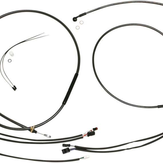 Caracteristicas: The only complete kits with matching braided cables and brake lines Kits include throttle and idle cables of throttle-by-wire extensions, clutch cable or hydraulic clutch line, brake lines, copper crush washers, hardware, and any necessary switch wiring of turn signal extension All cables are a low-effort, high-efficiency design that meets or exceeds all OE specifications for fitment, construction, endurance Kits for dual disc models include an all brazed manifold that eliminates leaks, alignment problems and unattractive threaded connections Assembled in the U.S.A. Kits are based on using ape hanger style handlebars with 2” risers