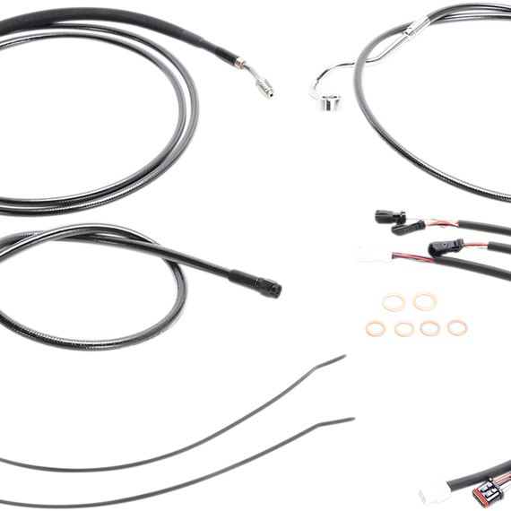 • Kits include throttle and idle cables of throttle-by-wire extensions, clutch cable or hydraulic clutch line, brake lines, copper crush washers, hardware, and any necessary switch wiring of turn signal extension