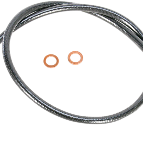 Caracteristicas: Manufactured with an enhanced construction designed to be compatible with Harley-Davidson ABS requirements for stock and alternate length brake lines- designed to follow the same routing path as OEM lines Brake kits consist of a direct fit lower assembly used in conjunction with alternative length upper lines Braid color and weave match all MAGNUM control cables and brake lines - Crystal clear outer jacket offers exceptional protection against scuffing paint or chrome and will never discolor Brake lines are constructed with PTFE inner tubing, DuPont™ Kevlar® aramid fiber, premium Signature Magnum braids and an outer PVC jacket to greatly reduce line expansion Upper, lower, mid brake line and adapter kits are sold separately to for a perfect fit. Compliant with all DOT FMVSS-106 requirements Assembled in the U.S.A. DuPont™ and Kevlar® are trademarks or registered trademarks of E.I. du Pont de Nemours and Company. Single disc Dyna and Sportster models use two kits – one upper and one lower. Softail models utilize 3 kits (except 2018+ dual disc), with the lower being optional on all. Upper kits are required for handlebar changes; by using either an upper brake line adapter or for 11–17 Softail models, the optional ABS Lower Brake Line Kit which includes the adapter. Adapter for Softail models allows the upper brake line to complete the connection from the ABS controller (2011-2017) or lower brake line (2018+) to the master cylinder If replacing the stock lower brake line assembly on 2018+ dual disc Softails, an adapter is NOT needed. Using -3AN fittings, the upper line connects directly to the Magnum lower assembly Dual disc Touring models use three kits - one upper, one lower and one mid-line. Trike models use two kits - one upper and one mid-line. No lower is available. A Designer mid-line and upper line is required for all Touring and Trike models with ABS. The mid-line connects to the upper brake line in the fairing or nacelle and completes the routing from the master cylinder to the ABS controller. A lower kit is optional. Non-stock applications require taking a measurement for upper brake line length and banjo angle to ensure correct fitment (see How to Order) Harley-Davidson motorcycles equipped with ABS (anti-lock brake system) require ABS specific upper and lower brake line kits. Failure to do so may result in compromised anti-lock braking ability. Magnum Shielding upper brake line kits manufactured specifically for these applications are identified with the letters “ABS” printed directly on the brake hose. Upper line length for Softail, Dyna, and 14+ Sportster models is determined by using your stock OE master cylinder brake line as a guide. Pull the rubber boot back and measure from the point at which the soft, flexible line enters the crimp collar on the lower portion. Follow the brake line routing up to your master cylinder. (see diagrams below) 2018+ Softail – Upper line replacement when reusing the stock lower brake line. (adapter required) Lengths are determined by using the stock master cylinder line for a guide. Measure from the lower brake line manifold where the upper line attaches, up to the master cylinder. From that measurement subtract 1.5” for the adapter and round up to the next number to determine upper line length. (see diagram below) 2018+ Softail Single Disc Upper and Lower line replacement requires an adapter. (3 kits) Adapter is NOT needed when replacing both the Upper and Lower 2018+ Softail Dual Disc brake lines. (2 Kits) The upper line connects directly to the Magnum Designer dual disc lower brake line. Follow the above instruction without subtracting 1.5” for the adapter. Rounded up, the length measured will be correct. Upper line length for Touring and Trike models is measured using the 49 inch mid-line as a reference to determine additional line length needed to complete the routing from the ABS controller to the master cylinder. That measurement will be your upper line length. (see diagram below).