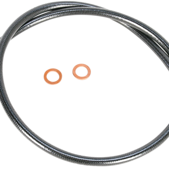 Caracteristicas: Manufactured with an enhanced construction designed to be compatible with Harley-Davidson ABS requirements for stock and alternate length brake lines- designed to follow the same routing path as OEM lines Brake kits consist of a direct fit lower assembly used in conjunction with alternative length upper lines Braid color and weave match all MAGNUM control cables and brake lines - Crystal clear outer jacket offers exceptional protection against scuffing paint or chrome and will never discolor Brake lines are constructed with PTFE inner tubing, DuPont™ Kevlar® aramid fiber, premium Signature Magnum braids and an outer PVC jacket to greatly reduce line expansion Upper, lower, mid brake line and adapter kits are sold separately to for a perfect fit. Compliant with all DOT FMVSS-106 requirements Assembled in the U.S.A. DuPont™ and Kevlar® are trademarks or registered trademarks of E.I. du Pont de Nemours and Company. Single disc Dyna and Sportster models use two kits – one upper and one lower. Softail models utilize 3 kits (except 2018+ dual disc), with the lower being optional on all. Upper kits are required for handlebar changes; by using either an upper brake line adapter or for 11–17 Softail models, the optional ABS Lower Brake Line Kit which includes the adapter. Adapter for Softail models allows the upper brake line to complete the connection from the ABS controller (2011-2017) or lower brake line (2018+) to the master cylinder If replacing the stock lower brake line assembly on 2018+ dual disc Softails, an adapter is NOT needed. Using -3AN fittings, the upper line connects directly to the Magnum lower assembly Dual disc Touring models use three kits - one upper, one lower and one mid-line. Trike models use two kits - one upper and one mid-line. No lower is available. A Designer mid-line and upper line is required for all Touring and Trike models with ABS. The mid-line connects to the upper brake line in the fairing or nacelle and completes the routing from the master cylinder to the ABS controller. A lower kit is optional. Non-stock applications require taking a measurement for upper brake line length and banjo angle to ensure correct fitment (see How to Order) Harley-Davidson motorcycles equipped with ABS (anti-lock brake system) require ABS specific upper and lower brake line kits. Failure to do so may result in compromised anti-lock braking ability. Magnum Shielding upper brake line kits manufactured specifically for these applications are identified with the letters “ABS” printed directly on the brake hose. Upper line length for Softail, Dyna, and 14+ Sportster models is determined by using your stock OE master cylinder brake line as a guide. Pull the rubber boot back and measure from the point at which the soft, flexible line enters the crimp collar on the lower portion. Follow the brake line routing up to your master cylinder. (see diagrams below) 2018+ Softail – Upper line replacement when reusing the stock lower brake line. (adapter required) Lengths are determined by using the stock master cylinder line for a guide. Measure from the lower brake line manifold where the upper line attaches, up to the master cylinder. From that measurement subtract 1.5” for the adapter and round up to the next number to determine upper line length. (see diagram below) 2018+ Softail Single Disc Upper and Lower line replacement requires an adapter. (3 kits) Adapter is NOT needed when replacing both the Upper and Lower 2018+ Softail Dual Disc brake lines. (2 Kits) The upper line connects directly to the Magnum Designer dual disc lower brake line. Follow the above instruction without subtracting 1.5” for the adapter. Rounded up, the length measured will be correct. Upper line length for Touring and Trike models is measured using the 49 inch mid-line as a reference to determine additional line length needed to complete the routing from the ABS controller to the master cylinder. That measurement will be your upper line length. (see diagram below).