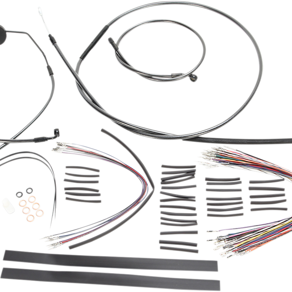 Caracteristicas: The only complete Handlebar Kits with matching braided cables and brake lines that include Magnum Caliber Handlebars Magnum 1-1/4" Caliber handlebars are manufactured with the highest quality construction, including machined control mounts (not swaged) and feature high luster finish for an unsurpassed appearance All handlebars are 1-1/4" diameter with 1" diameter center section and 3-1/2" on-center knurling, work with standard controls, including hydraulic clutch, and are machined for internal wiring and electric throttle control All Caliber Handlebars are preloaded with E-Z pull-thru sleeving to make wiring installations a breeze Kits include: Magnum 1-1/4" Caliber Handlebars, throttle and idle cables or throttle-by-wire extensions, a clutch cable or hydraulic clutch line, brake lines, copper crush washers, hardware, and any necessary switch wiring or turn signal extensions All cables are a low effort, high efficiency design that meets or exceeds all OE specifications for fitment, construction, endurance Kits for dual disc models include an all brazed manifold that eliminates leaks, alignment problems, and unattractive threaded connections Brake lines exceed all DOT FMVSS-106 requirements Assembled in the U.S.A. Caliber Handlebars have a 1" diameter center section and fit 1" risers. Models originally equipped with handlebars that have a center section diameter larger than 1" will require changing the risers to a 1" ID version. Examples would be, but not limited to FLSTF, FLSTFB and CVO models. Please check before ordering.