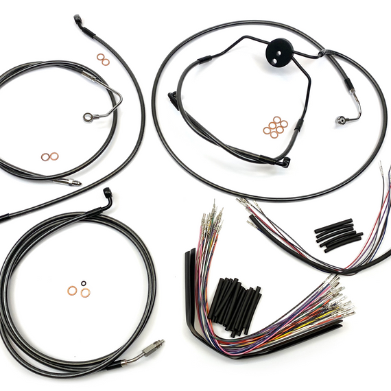 • Kits include throttle and idle cables of throttle-by-wire extensions, clutch cable or hydraulic clutch line, brake lines, copper crush washers, hardware, and any necessary switch wiring of turn signal extension