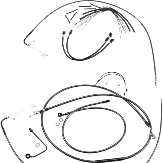 • Kits include throttle and idle cables of throttle-by-wire extensions, clutch cable or hydraulic clutch line, brake lines, copper crush washers, hardware, and any necessary switch wiring of turn signal extension
