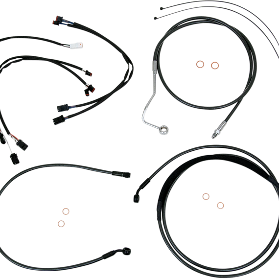 Caracteristicas: Reuses existing lower brake line The only complete kits with matching braided cables and brake lines Kits include throttle and idle cables of throttle-by-wire extensions, clutch cable or hydraulic clutch line, brake lines, copper crush washers, hardware, and any necessary switch wiring of turn signal extension All cable and brake lines feature Black Pearl braid with highly polished black chrome plated fittings All cables are a low-effort, high-efficiency design that meets or exceeds all OE specifications for fitment, construction, endurance Kits for dual disc models include an all brazed manifold that eliminates leaks, alignment problems and unattractive threaded connections Assembled in the U.S.A. Kits are based on using ape hanger style handlebars with 2†risers