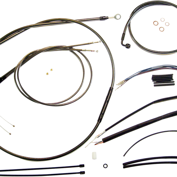 Caracteristicas: The only complete kits with matching braided cables and brake lines Kits include throttle and idle cables of throttle-by-wire extensions, clutch cable or hydraulic clutch line, brake lines, copper crush washers, hardware, and any necessary switch wiring of turn signal extension All cables are a low-effort, high-efficiency design that meets or exceeds all OE specifications for fitment, construction, endurance Kits for dual disc models include an all brazed manifold that eliminates leaks, alignment problems and unattractive threaded connections Assembled in the U.S.A. Kits are based on using ape hanger style handlebars with 2†risers