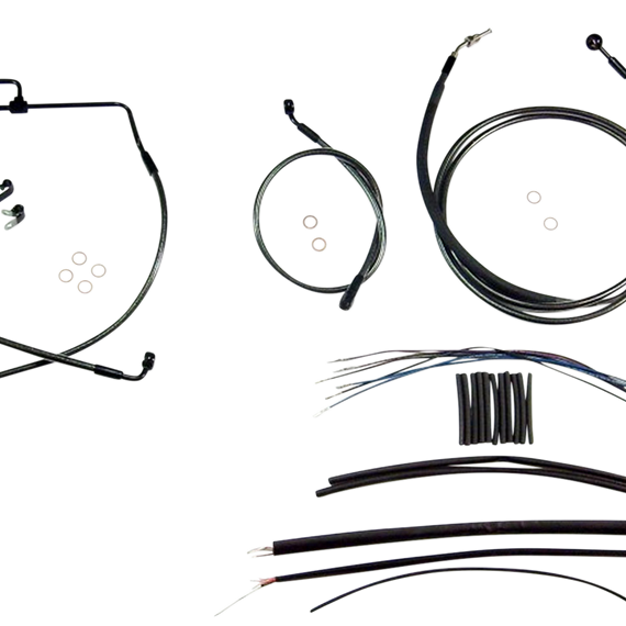 Caracteristicas: The only complete kits with matching braided cables and brake lines Kits include throttle and idle cables of throttle-by-wire extensions, clutch cable or hydraulic clutch line, brake lines, copper crush washers, hardware, and any necessary switch wiring of turn signal extension All cables are a low-effort, high-efficiency design that meets or exceeds all OE specifications for fitment, construction, endurance Kits for dual disc models include an all brazed manifold that eliminates leaks, alignment problems and unattractive threaded connections Assembled in the U.S.A. Kits are based on using ape hanger style handlebars with 2†risers