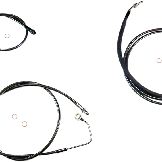 Caracteristicas: Reuses existing lower brake line The only complete kits with matching braided cables and brake lines Kits include throttle and idle cables of throttle-by-wire extensions, clutch cable or hydraulic clutch line, brake lines, copper crush washers, hardware, and any necessary switch wiring of turn signal extension All cable and brake lines feature Black Pearl braid with highly polished black chrome plated fittings All cables are a low-effort, high-efficiency design that meets or exceeds all OE specifications for fitment, construction, endurance Kits for dual disc models include an all brazed manifold that eliminates leaks, alignment problems and unattractive threaded connections Assembled in the U.S.A. Kits are based on using ape hanger style handlebars with 2†risers
