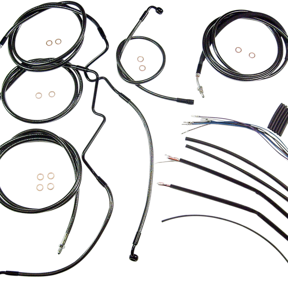 Caracteristicas: The only complete kits with matching braided cables and brake lines Kits include throttle and idle cables of throttle-by-wire extensions, clutch cable or hydraulic clutch line, brake lines, copper crush washers, hardware, and any necessary switch wiring of turn signal extension All cables are a low-effort, high-efficiency design that meets or exceeds all OE specifications for fitment, construction, endurance Kits for dual disc models include an all brazed manifold that eliminates leaks, alignment problems and unattractive threaded connections Assembled in the U.S.A. Kits are based on using ape hanger style handlebars with 2†risers