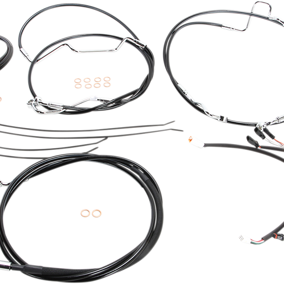 Caracteristicas: Magnum XR Handlebar Installation Kits offer a great fit and excellent quality at an economical price Kit features highly polished, chrome plated fittings All cables are a low effort, high efficiency design that meets or exceeds all OE specifications for fitment, construction, endurance Magnum XR Brake Lines use an enhanced construction of heavy gauge stainless steel embedded in tough abrasion resistant nylon outer jacket for superior durability and extreme braking response for safe riding The coating on cables and brake lines offers exceptional protection for paint or chrome Kits that include manifolds use an all brazed construction to ensure optimal OE fitment and appearance Manifolds use -3 AN connections for an easy installation Kits include throttle and idle cables or throttle-by-wire extensions, clutch cable or XR hydraulic clutch line, XR brake lines, copper crush washers, hardware, turn signal and switch wiring extensions Kits are based on using ape hanger style handlebars and 2" risers.