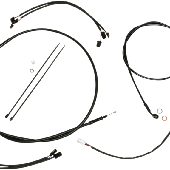 Caracteristicas: Magnum XR Handlebar Installation Kits offer a great fit and excellent quality at an economical price Kit features highly polished, chrome plated fittings All cables are a low effort, high efficiency design that meets or exceeds all OE specifications for fitment, construction, endurance Magnum XR Brake Lines use an enhanced construction of heavy gauge stainless steel embedded in tough abrasion resistant nylon outer jacket for superior durability and extreme braking response for safe riding The coating on cables and brake lines offers exceptional protection for paint or chrome Kits that include manifolds use an all brazed construction to ensure optimal OE fitment and appearance Manifolds use -3 AN connections for an easy installation Kits include throttle and idle cables or throttle-by-wire extensions, clutch cable or XR hydraulic clutch line, XR brake lines, copper crush washers, hardware, turn signal and switch wiring extensions Kits are based on using ape hanger style handlebars and 2" risers.