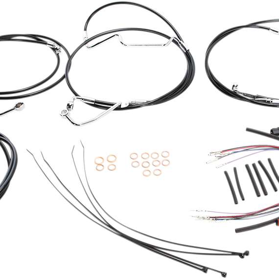 Caracteristicas: Magnum XR Handlebar Installation Kits offer a great fit and excellent quality at an economical price Kit features highly polished, chrome plated fittings All cables are a low effort, high efficiency design that meets or exceeds all OE specifications for fitment, construction, endurance Magnum XR Brake Lines use an enhanced construction of heavy gauge stainless steel embedded in tough abrasion resistant nylon outer jacket for superior durability and extreme braking response for safe riding The coating on cables and brake lines offers exceptional protection for paint or chrome Kits that include manifolds use an all brazed construction to ensure optimal OE fitment and appearance Manifolds use -3 AN connections for an easy installation Kits include throttle and idle cables or throttle-by-wire extensions, clutch cable or XR hydraulic clutch line, XR brake lines, copper crush washers, hardware, turn signal and switch wiring extensions Kits are based on using ape hanger style handlebars and 2" risers.