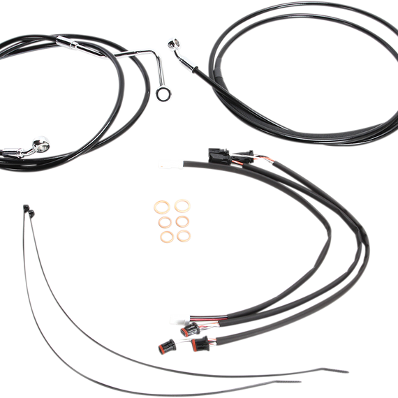 Caracteristicas: Magnum XR Handlebar Installation Kits offer a great fit and excellent quality at an economical price Kit features highly polished, chrome plated fittings All cables are a low effort, high efficiency design that meets or exceeds all OE specifications for fitment, construction, endurance Magnum XR Brake Lines use an enhanced construction of heavy gauge stainless steel embedded in tough abrasion resistant nylon outer jacket for superior durability and extreme braking response for safe riding The coating on cables and brake lines offers exceptional protection for paint or chrome Kits that include manifolds use an all brazed construction to ensure optimal OE fitment and appearance Manifolds use -3 AN connections for an easy installation Kits include throttle and idle cables or throttle-by-wire extensions, clutch cable or XR hydraulic clutch line, XR brake lines, copper crush washers, hardware, turn signal and switch wiring extensions Kits are based on using ape hanger style handlebars and 2" risers.