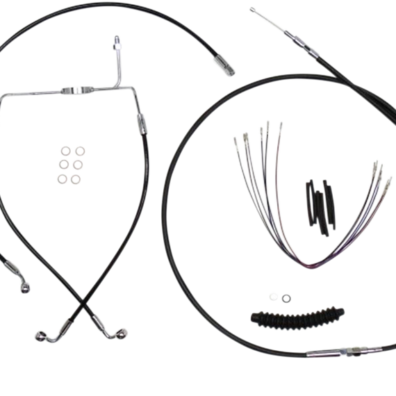 Caracteristicas: Magnum XR Handlebar Installation Kits offer a great fit and excellent quality at an economical price Kit features highly polished, chrome plated fittings All cables are a low effort, high efficiency design that meets or exceeds all OE specifications for fitment, construction, endurance Magnum XR Brake Lines use an enhanced construction of heavy gauge stainless steel embedded in tough abrasion resistant nylon outer jacket for superior durability and extreme braking response for safe riding The coating on cables and brake lines offers exceptional protection for paint or chrome Kits that include manifolds use an all brazed construction to ensure optimal OE fitment and appearance Manifolds use -3 AN connections for an easy installation Kits include throttle and idle cables or throttle-by-wire extensions, clutch cable or XR hydraulic clutch line, XR brake lines, copper crush washers, hardware, turn signal and switch wiring extensions Kits are based on using ape hanger style handlebars and 2" risers.