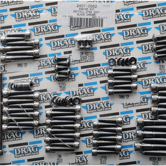 Caracteristicas: Complete motor sets for Big Twin include bolts for primary, cam, cam sensor, derby, rocker box, transmission top, transmission side, lifter block and clutch covers Complete motor sets for XL include bolts for primary, cam, derby, lifter block, points cover, rocker box and engine case Made in the U.S.A.