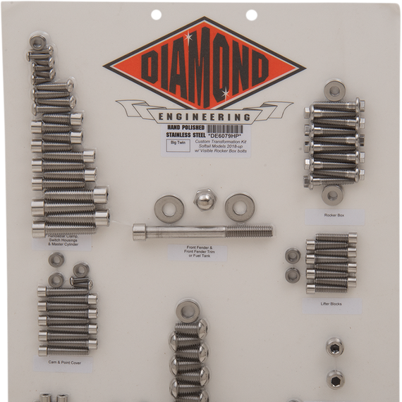 Caracteristicas: Customize a bike without having to completely disassemble it Groups of polished stainless steel fasteners covering the engine, transmission and the most visible areas of the motorcycle Kits add detail and a custom look with ease Kits include fasteners for primary, inspections and inner primary; cam and points; oil pump or oil line cover, filter mount and sensors (Dyna and Twin Cam FLHT) or oil filter plugs and sensors (Softail Twin Cam); lifter blocks; rocker box; coil and circuit breaker covers (Dyna); transmission side cover; oil filler (FLHT models); transmission top cover; handlebar clamp, switch housings and master cylinder; front fender or front fender trim and fuel tank (FLHT models); rear fender rail or swingarm pivot blocks and rear floorboard brackets (FLHT models) Made in the U.S.A.