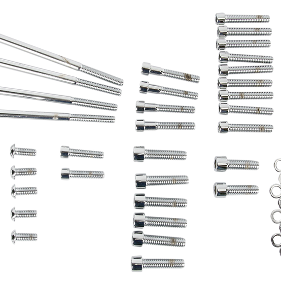 Caracteristicas: Kits feature polished stainless steel or polished chrome steel socket-head bolts Motor sets for Twin Cam include cam cover, primary cover, transmission side cover, oil hose cover, lifter base, rocker box, front inner primary, washer, motor and transmission mount bolts Motor set for M-Eight includes cam cover, primary cover, transmission covers, electric module cover, lifter base, rock boxes, top front motor mount and rear motor mount Side cover set include cam, primary, oil hose cover and transmission side cover Primary set include primary, inspection and derby cover Made in the U.S.A.