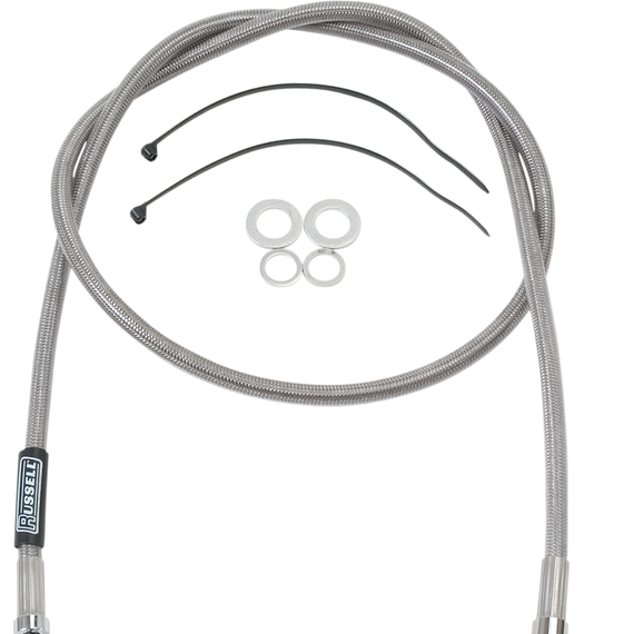 Caracteristicas: Using all stock mounting locations and hardware, simply route your hose and attach the banjo at the master cylinder The banjo is incorporated at the caliper end of the hose assembly Features Russell's exclusive 360° swivel banjo system Engineered using two O-rings for a positive seal All lines have a 3/8" 90° banjo at the caliper end Makes the rotation alignment hassle free