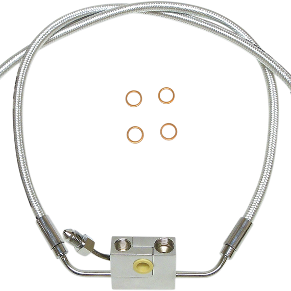 Caracteristicas: If replacing the stock lower brake line assembly on '18+ dual disc Softails, an adapter is NOT needed. Using AN-3 fittings, the upper line connects directly to the Magnum lower assembly Brake lines are constructed with PTFE inner tubing, DuPont™ Kevlar® aramid fiber, premium Signature Magnum braids and an outer PVC jacket to greatly reduce line expansion Manufactured with an enhanced construction designed to be compatible with Harley-Davidson ABS requirements for stock and alternate length brake lines Brake kits consist of a direct fit lower assembly used in conjunction with alternative length upper lines AN-3 connections make for easy installations Assembled in the U.S.A.