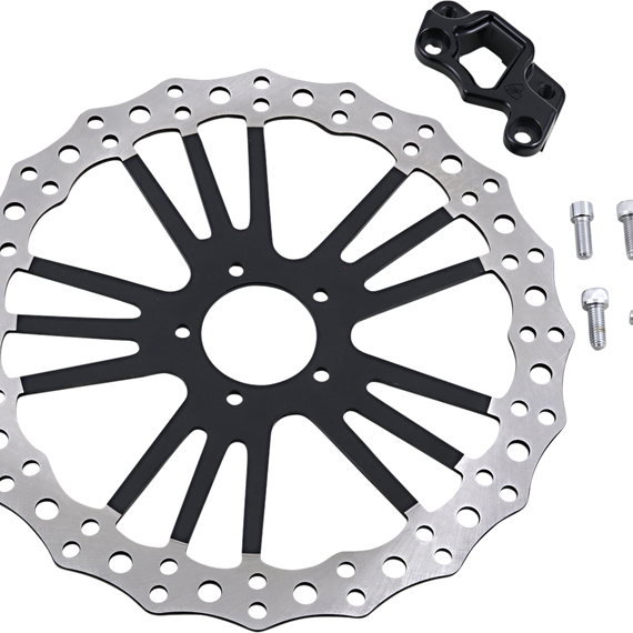 Caracteristicas: Add braking performance and style to your Indian Scout 14" front rotors are drastically larger than stock resulting in increased braking performance, billet brake caliper adapter included to properly relocate factory caliper Great way to improve the look by adding race styling to your factory wheel Bolt-on install, no fabrication or re-bleeding of the brakes required Will not fit Scout models equipped with ABS when relocating the caliper. The ABS sensor is attached and will not read the ABS timing ring.