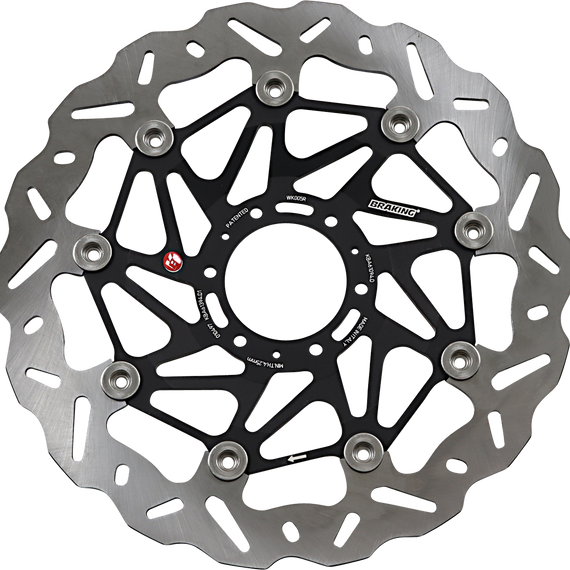 Caracteristicas: Outer and inner diameter of the disk have a non-round design that enables better radial expansion of the rotor under extreme heat conditions Piercing holes are replaced by edges specifically designed to improve brake pad performance Floating disk with steel carrier OEM diameter; directional design for left or right side