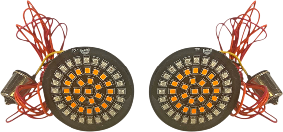 Caracteristicas: Rear 1156 LED turn signal insert made with 48 LEDs per unit Outer ring of 24 red LEDs function as a running and brake light 24 center amber LEDs function as turn signals 36” wire leads DOT compliant