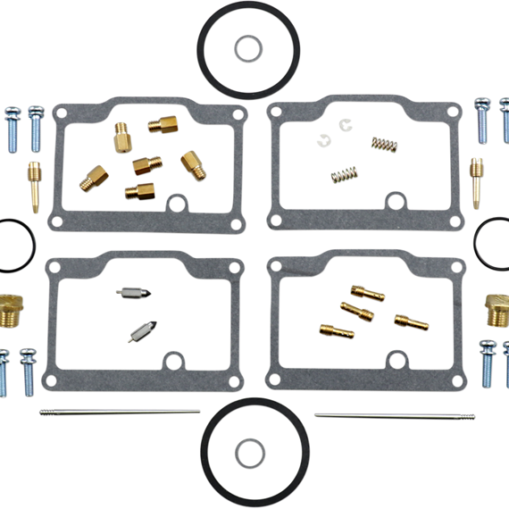Caracteristicas: Kit includes all necessary O-rings, gaskets, jets, needle, mixture screw, float bowl screws, float valve needle and seat (needle jet and other pressed-in jets are not included in kit) NBR rubber material is used on all O-rings and rubber gaskets; NBR has excellent resistance to the ethanol used in today's fuels Applications that use paper float bowl gaskets are upgraded to High Performance Interference Gasket material Models with multiple carburetors include components to repair all carburetors OEM jet sizes and slide needles are included in the kit