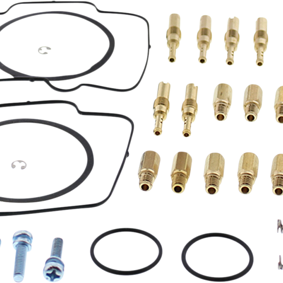Caracteristicas: Kit includes all necessary O-rings, gaskets, jets, needle, mixture screw, float bowl screws, float valve needle and seat (needle jet and other pressed-in jets are not included in kit) NBR rubber material is used on all O-rings and rubber gaskets; NBR has excellent resistance to the ethanol used in today's fuels Applications that use paper float bowl gaskets are upgraded to High Performance Interference Gasket material Models with multiple carburetors include components to repair all carburetors OEM jet sizes and slide needles are included in the kit