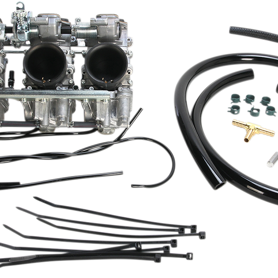 Caracteristicas: Designed for inline four-cylinder performance to offer higher horsepower gains with the world's top motorcycle road race and drag race teams Offer smooth, controllable throttle response with precise fuel-metering demands with high-volume fuel/air required by race engines Flat throttle valve design provides the strongest signal for precise and instantaneous throttle response Accelerator pump spray nozzle shoots fuel directly into the intake tract for immediate engine response Check carb spacing to verify fitments; use spacing chart on how to check spacing Jetting may need to be changed per application, see chart for included jetting Float bowl vent allows atmospheric pressure into float bowl for fuel flow Larger-diameter spigot O.D.'s may require different mounting flanges Include adjustable accelerator pump and adjustable idle screw Adjustable throttle return spring allows spring return pressure Include enrichment starter system for easier cold starting Jet needle has easy adjustment slots for quick tuning Made in Japan