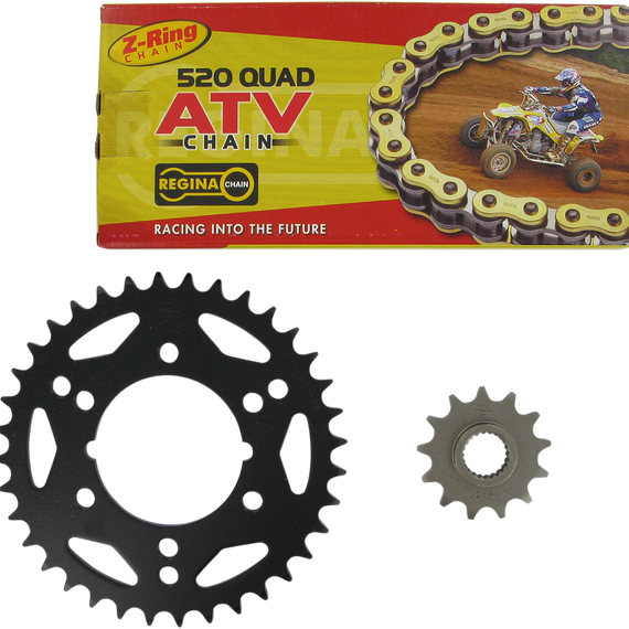 Caracteristicas: Economical kit comes with precut chain and front and rear sprockets Chain is Regina’s high-performance 520 Quad Z-ring series (8,000 ft./lb. strength) with gold outer plates and Z sealing rings, which dramatically improve performance and wear life; includes clip-type masterlink Sprockets are made of high-quality steel and have OEM gearing