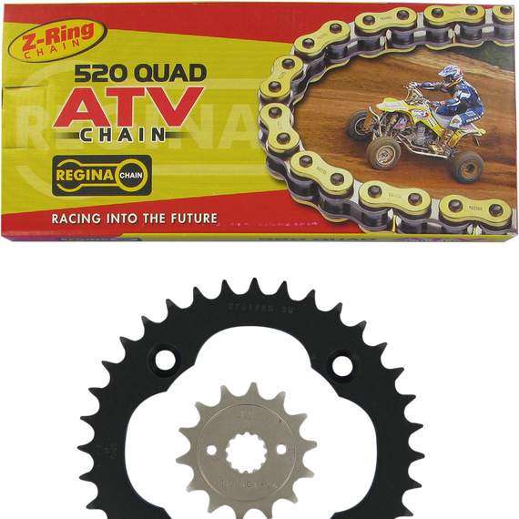 • Chain is Regina’s high-performance 520 Quad Z-ring series (8,000 ft./lb. strength) with gold outer plates and Z sealing rings, which dramatically improve performance and wear life; includes clip-type masterlink