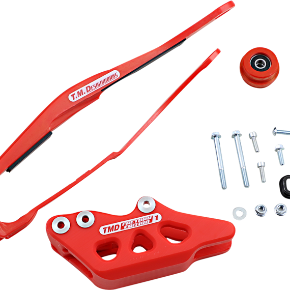 Caracteristicas: The kit includes front slider, lower frame pad & FE #2 rear guide with replaceable wear pad. Noise dampening pad system lowers chain slap noise. A special chain guidance backing plate keeps the chain constantly centered to improve suspension. The lower Powerlip frame pad last longer but more importantly lowers surface drag.