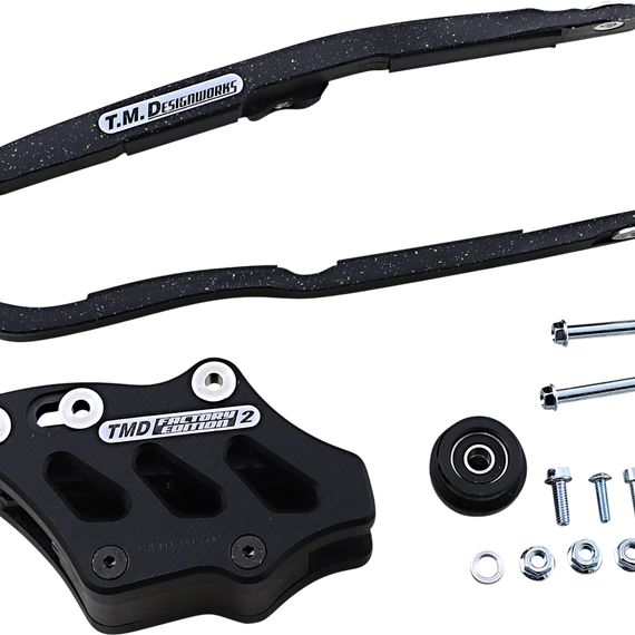 Caracteristicas: The kit includes front slider, lower frame pad & FE #2 rear guide with replaceable wear pad. Noise dampening pad system lowers chain slap noise. A special chain guidance backing plate keeps the chain constantly centered to improve suspension. The lower Powerlip frame pad last longer but more importantly lowers surface drag.