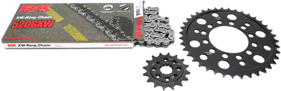 Caracteristicas: Kits includes a premium Driven® C45 steel alloy black case hardened rear sprocket paired with Driven® C45 steel case hardened and quenched front sprocket RK’s 520 Steel Quick Acceleration Race Kit combines the enhanced performance of race gearing and durability of steel components Kit includes a one-tooth-smaller-than-OE front sprocket
