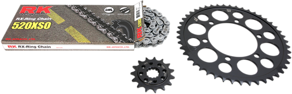 Caracteristicas: Kits includes a premium Driven® C45 steel alloy black case hardened rear sprocket paired with Driven® C45 steel case hardened and quenched front sprocket RK’s 520 Steel Quick Acceleration Race Kit combines the enhanced performance of race gearing and durability of steel components Kit includes a one-tooth-smaller-than-OE front sprocket