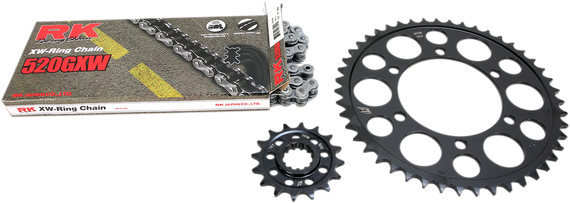Caracteristicas: Kits includes a premium Driven® C45 steel alloy black case hardened rear sprocket paired with Driven® C45 steel case hardened and quenched front sprocket RK’s 520 Steel Quick Acceleration Race Kit combines the enhanced performance of race gearing and durability of steel components Kit includes a one-tooth-smaller-than-OE front sprocket