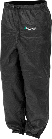 Caracteristicas: The Classic Frogg Toggs rain pants Made of waterproof, breathable, 100% non-woven polypropylene material Lightweight 17 oz. design makes these pants compact and easy to store Bomber-style pants feature 1" waist band with adjustable locking shock cord, 1" ankle band with elastic and hook-and-loop closure, an expanded 4" back rise for added protection and molded polymer zippers and polymer snaps Because exhaust pipes are likely to come in contact with the rain pants, the use of Smokin' Toad Heatshield and Patch Kit is recommended.
