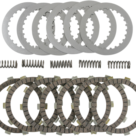 Caracteristicas: Anti-swell, alloy-impregnated heavy-duty cork-based facings for smooth clutch take-up Allow modulation, unlike paper clutches that tend to snatch Complete engine set of friction plates, HD springs and steel separator plates prevent premature driven plate wear, oil muddying and loss of stack height Built with swagged aluminum carriers that spread the load on the clutch basket and prevent clutch basket "dogging" 10-15% uprated heavy duty clutch springs