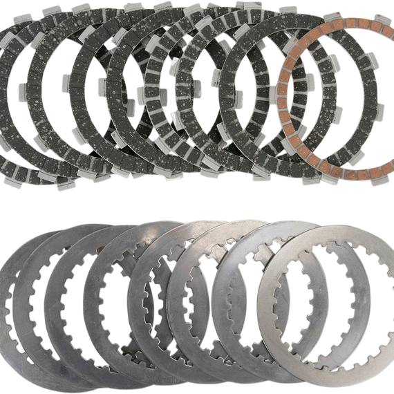 Caracteristicas: Get all the performance without all the fade or slip Get all the performance without all the fade or slip Friction plates are ready to fit - no need to pre-soak in oil Friction plates are ready to fit - no need to pre-soak in oil Designed to ensure ultra-smooth power delivery Designed to ensure ultra-smooth power delivery More durable than OEM clutch plates More durable than OEM clutch plates High-heat friction material for fade-free performance High-heat friction material for fade-free performance Clutch springs are shot-peened for maximum life, heat-treated and precision-wound using only the finest chrome silicon Clutch springs are shot-peened for maximum life, heat-treated and precision-wound using only the finest chrome silicon Springs are individually designed for each application to ensure easy operation and great feel at the lever Springs are individually designed for each application to ensure easy operation and great feel at the lever Kits available with or without steel friction plates Steel friction plates are precision-made using exacting tolerances Steel friction plates are precision-made using exacting tolerances Plates are heat-treated for maximum life Plates are heat-treated for maximum life Will not muddy or contaminate oil Will not muddy or contaminate oil Both styles of clutch kit include friction plates and springs (unless noted in part specific text)