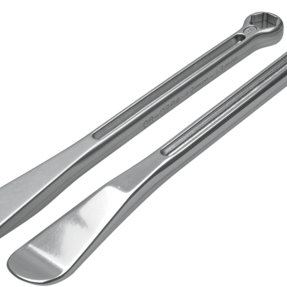 Caracteristicas: Perfectly contoured tire lever on one end and a unique combination stepped 12 mm - 13 mm box end wrench on other end for turning rim lock nuts or a hex box wrench sized for axle nuts on other end Hex ends for axle nuts are rated for a maximum torque of 90 ft-lbs Tire spoons with axle nut hex wrench or rim lock nut set