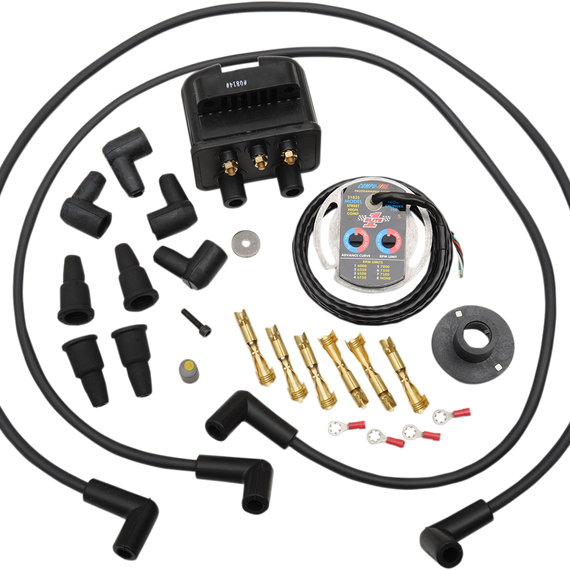 Caracteristicas: Easy way to convert stock ignition systems to single-fire system Kits feature Compu-fire ignition module, high-output single-fire Fire coil which mounts in the stock location and under the stock coil cover, and a set of silicone-jacketed spiral-core spark plug wires Ignition modules feature eight pre-programmed advance curves Tunable VOES adds 5 or 10 degrees vacuum advance Easy installation with LED static timing light Selectable rpm limiter from 6000 rpm to unlimited Made in the U.S.A. Not for fuel-injected models.