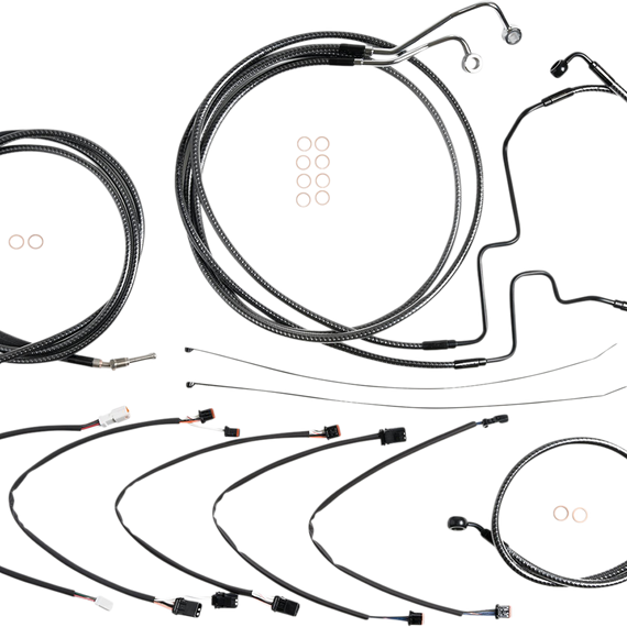 Caracteristicas: KARBONFIBR wire braid is created from distinct black and gray tone wire colors which are blended and interwoven together to mimic the look of hi-tech carbon fiber. This unique alternative black braid highly complements black or blackout color scheme motorcycles Kits include – Premium DOT brake lines, clutch cable or hydraulic clutch line, throttle and idle cables or throttle-by-wire extensions, hardware, and fully terminated or plug-and-play switch and turn signal extensions Matching KARBONFIBR braided hydraulic lines and control cables provide a precise, OE fit KARBONFIBR high-efficiency cables feature anti-friction liners and inserts, durable clear coating, are factory lubricated for smooth, long-lasting operation, plus they meet or exceed OE specifications Clutch cables include a water-proof adjuster and a transmission fitting seal to eliminate oil leaks Premium KARBONFIBR DOT brake lines incorporate PTFE tubing braided with DuPontTM Kevlar® Aramid Fiber reinforcement, Signature braid, and a clear PVC jacket Every Magnum brake line is pressure tested and fully FMVSS-106 compliant