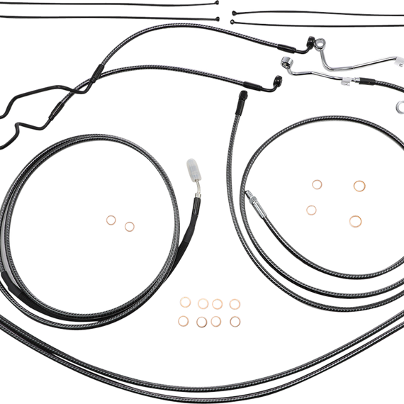 Caracteristicas: KARBONFIBR wire braid is created from distinct black and gray tone wire colors which are blended and interwoven together to mimic the look of hi-tech carbon fiber. This unique alternative black braid highly complements black or blackout color scheme motorcycles Kits include – Premium DOT brake lines, clutch cable or hydraulic clutch line, throttle and idle cables or throttle-by-wire extensions, hardware, and fully terminated or plug-and-play switch and turn signal extensions Matching KARBONFIBR braided hydraulic lines and control cables provide a precise, OE fit KARBONFIBR high-efficiency cables feature anti-friction liners and inserts, durable clear coating, are factory lubricated for smooth, long-lasting operation, plus they meet or exceed OE specifications Clutch cables include a water-proof adjuster and a transmission fitting seal to eliminate oil leaks Premium KARBONFIBR DOT brake lines incorporate PTFE tubing braided with DuPontTM Kevlar® Aramid Fiber reinforcement, Signature braid, and a clear PVC jacket Every Magnum brake line is pressure tested and fully FMVSS-106 compliant