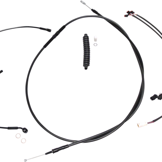 Caracteristicas: Magnum XR Handlebar Installation Kits offer a great fit and excellent quality at an economical price Kit features highly polished, chrome plated fittings All cables are a low effort, high efficiency design that meets or exceeds all OE specifications for fitment, construction, endurance Magnum XR Brake Lines use an enhanced construction of heavy gauge stainless steel embedded in tough abrasion resistant nylon outer jacket for superior durability and extreme braking response for safe riding The coating on cables and brake lines offers exceptional protection for paint or chrome Kits that include manifolds use an all brazed construction to ensure optimal OE fitment and appearance Manifolds use -3 AN connections for an easy installation Kits include throttle and idle cables or throttle-by-wire extensions, clutch cable or XR hydraulic clutch line, XR brake lines, copper crush washers, hardware, turn signal and switch wiring extensions Kits are based on using ape hanger style handlebars and 2" risers.