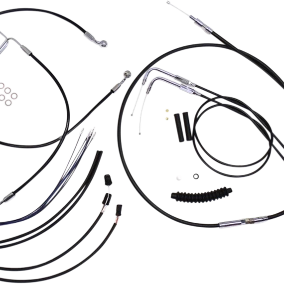 Caracteristicas: Magnum XR Handlebar Installation Kits offer a great fit and excellent quality at an economical price Kit features highly polished, chrome plated fittings All cables are a low effort, high efficiency design that meets or exceeds all OE specifications for fitment, construction, endurance Magnum XR Brake Lines use an enhanced construction of heavy gauge stainless steel embedded in tough abrasion resistant nylon outer jacket for superior durability and extreme braking response for safe riding The coating on cables and brake lines offers exceptional protection for paint or chrome Kits that include manifolds use an all brazed construction to ensure optimal OE fitment and appearance Manifolds use -3 AN connections for an easy installation Kits include throttle and idle cables or throttle-by-wire extensions, clutch cable or XR hydraulic clutch line, XR brake lines, copper crush washers, hardware, turn signal and switch wiring extensions Kits are based on using ape hanger style handlebars and 2" risers.