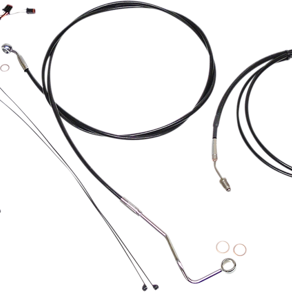 Caracteristicas: Magnum XR Handlebar Installation Kits offer a great fit and excellent quality at an economical price Kit features highly polished, chrome plated fittings All cables are a low effort, high efficiency design that meets or exceeds all OE specifications for fitment, construction, endurance Magnum XR Brake Lines use an enhanced construction of heavy gauge stainless steel embedded in tough abrasion resistant nylon outer jacket for superior durability and extreme braking response for safe riding The coating on cables and brake lines offers exceptional protection for paint or chrome Kits that include manifolds use an all brazed construction to ensure optimal OE fitment and appearance Manifolds use -3 AN connections for an easy installation Kits include throttle and idle cables or throttle-by-wire extensions, clutch cable or XR hydraulic clutch line, XR brake lines, copper crush washers, hardware, turn signal and switch wiring extensions Kits are based on using ape hanger style handlebars and 2" risers.