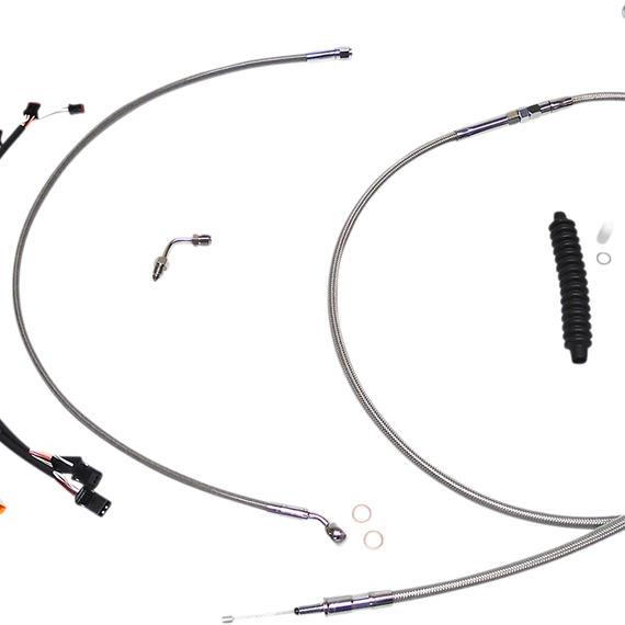 Caracteristicas: Magnum XR Handlebar Installation Kits offer a great fit and excellent quality at an economical price Kit features highly polished, chrome plated fittings All cables are a low effort, high efficiency design that meets or exceeds all OE specifications for fitment, construction, endurance Magnum XR Brake Lines use an enhanced construction of heavy gauge stainless steel embedded in tough abrasion resistant nylon outer jacket for superior durability and extreme braking response for safe riding The coating on cables and brake lines offers exceptional protection for paint or chrome Kits that include manifolds use an all brazed construction to ensure optimal OE fitment and appearance Manifolds use -3 AN connections for an easy installation Kits include throttle and idle cables or throttle-by-wire extensions, clutch cable or XR hydraulic clutch line, XR brake lines, copper crush washers, hardware, turn signal and switch wiring extensions Kits are based on using ape hanger style handlebars and 2" risers.