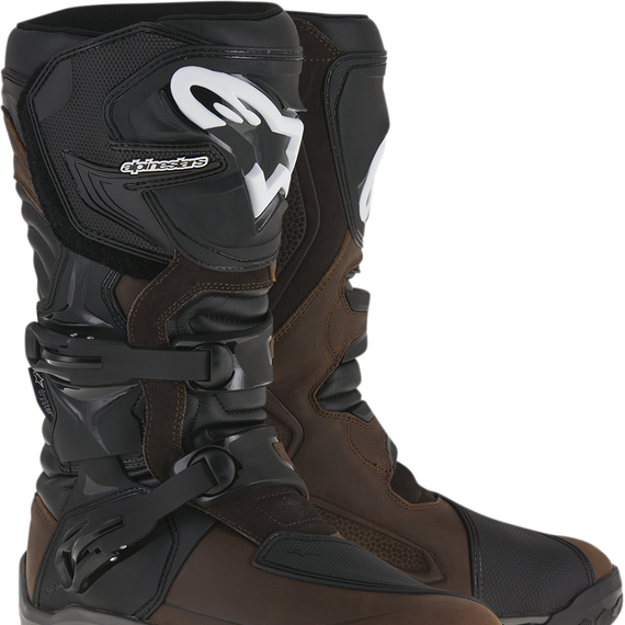 Caracteristicas: The upper is constructed from full grain oiled leather on lower medial panel, both with heat press texture for superior grip Front and rear bellow made with lightweight microfiber for more durability and abrasion resistance Extended PU coated leather gaiter helps seal out excessive water and dirt entry; rear gaiter includes rubber insert for flexibility and comfort New closure system includes 2 polymer buckles with an innovative closure system. This closure includes a ratchet with memory and a quick release/locking system with self-aligning design for easy, precise closure Drystar® membrane layer between upper and lining for proven performance in difficult weather conditions PU shift pad made with technical texture for added grip plus foam padding underneath for better comfort Wide entry aperture for convenience with Velcro® upper closure flap to allow broad ranging calf fit adjustment Alpinestars exclusive vulcanized rubber compound for optimal combination of comfort and grip Replaceable anatomical EVA foot bed with Lycra® lining on top TPU shin plate and calf plate offer support and resistance for impacts Bio-mechanical lateral flexi-blade system provides excellent front and rear movement while offering support and protection to the ankle TPU double density ankles protector on medial side for protection Soft foams surrounds the ankles and collar offer comfort and shock absorbing performance Toe box and heel counter reinforcement are layered under the upper PP insole with steel shank co-injected for excellent feel and safety