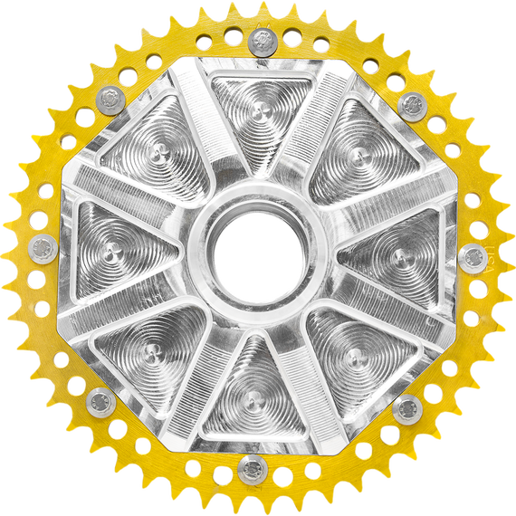Caracteristicas: CNC-machined billet aluminum carrier and hub adapter CNC-machined sprocket made of 1026 medium- to high-carbon steel Fits stock or aftermarket wheel Made in the U.S.A.